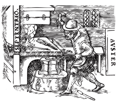 Ilustração do De Magnete mostrando o processo de magnetização de uma barra metálica incandescente através de resfriamento em direção orientada pelo campo magnético da Terra (Septentrio = Norte; Auster = Sul).